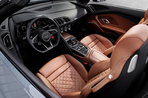 The tight lines of the design set the tone inside the car as well. Its most eye-catching element is the “Monoposto” – the large, heavily contoured arch that spans the area in front of the driver’s seat and is strongly reminiscent of a racecar cockpit. The “Monoposto” encloses the Audi virtual cockpit with a 12.3-inch screen, which is integrated into a freestanding casing. The R8 leather steering wheel with Multifunction plus offers two or, in the performance quattro version, four control satellites, each for using Audi drive select, to start the engine, to activate Performance Mode and the engine sound as well as to control the Audi virtual cockpit. Drivers and passengers can enjoy the ride in their optionally available R8 bucket or sport seats, upholstered in leather. A badge with the RWD emblem shimmers in front of the passenger seat.