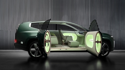 The flat floor allows Hyundai Motor to explore an alternative to the traditional row-based seat arrangements, creating a more fluid interior layout. The Pillarless Coach Doors offer a grand entrance to reveal a welcoming interior with a completely new dimension of space. The streamlined roofline, long wheelbase and flat floor that extends to the third row opens new opportunities to furnish the interior like a premium lounge.