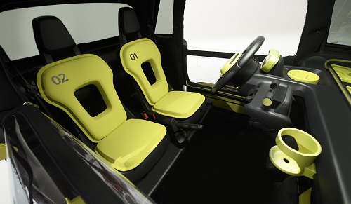 My Ami Buggy Concept is finished in three main colours: black, khaki and yellow. The black, inspired by camping equipment, reinforces the functional and robust nature of the vehicle. The different shades of black – Anodised Black on the wheel arches and roof, and Speckled Black for a hammered effect at the rear – perfectly complement the Anodized Khaki and Citric Yellow shades, combining to convey an adventurous go-anywhere appearance.