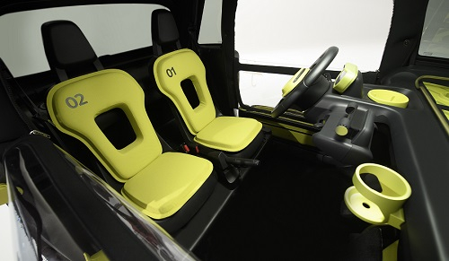 Many key elements of My Ami Buggy Concept are highlighted by an occasional dash of Citric Yellow, including the seats, the charging cable, on the pods at the bottom of the door apertures, in the luggage area and on a number of accessories. This zingy colour also indicates that the highlighted objects serve a functional purpose.