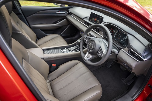 Other materials unique to this range-topping Mazda6 include Ultrasuade NU trim on the lower dashboard and door trims, real Japanese Sen wood on the upper dashboard and door trims, unique steering wheel stitching with a chrome centre wheel bezel and a frameless rear view mirror.