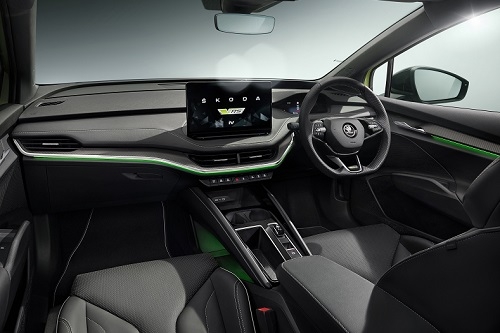 To further enhance the ENYAQ’s responsive driving experience, the Coupé iV vRS is equipped as standard with a sports chassis that is 15mm lower at the front and 10mm at the rear. Dynamic steering is also standard on vRS models.